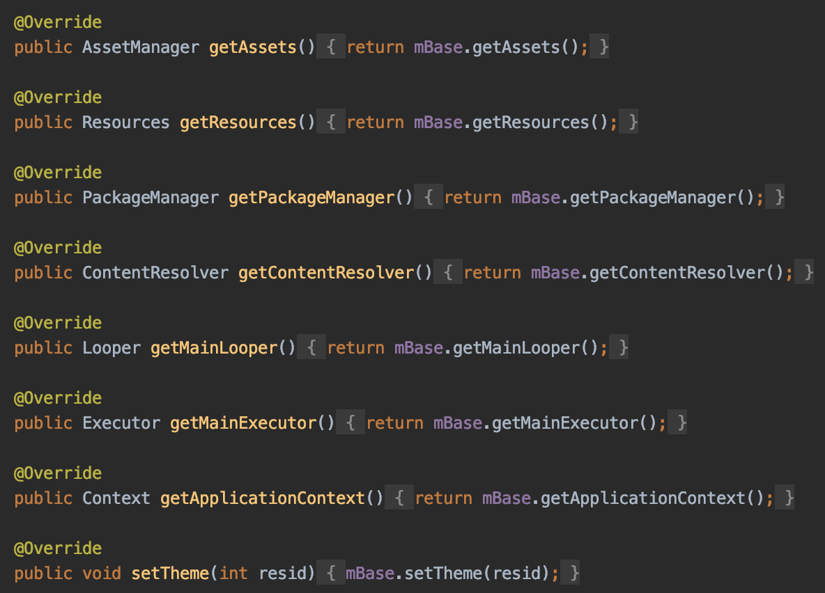 코드에서 볼 수 있듯이 ContextWrapper는 생성자로 Context의 구현체를 받는다. 그리고 Context의 모든 동작을 Context 구현체의 함수로 위임한다.