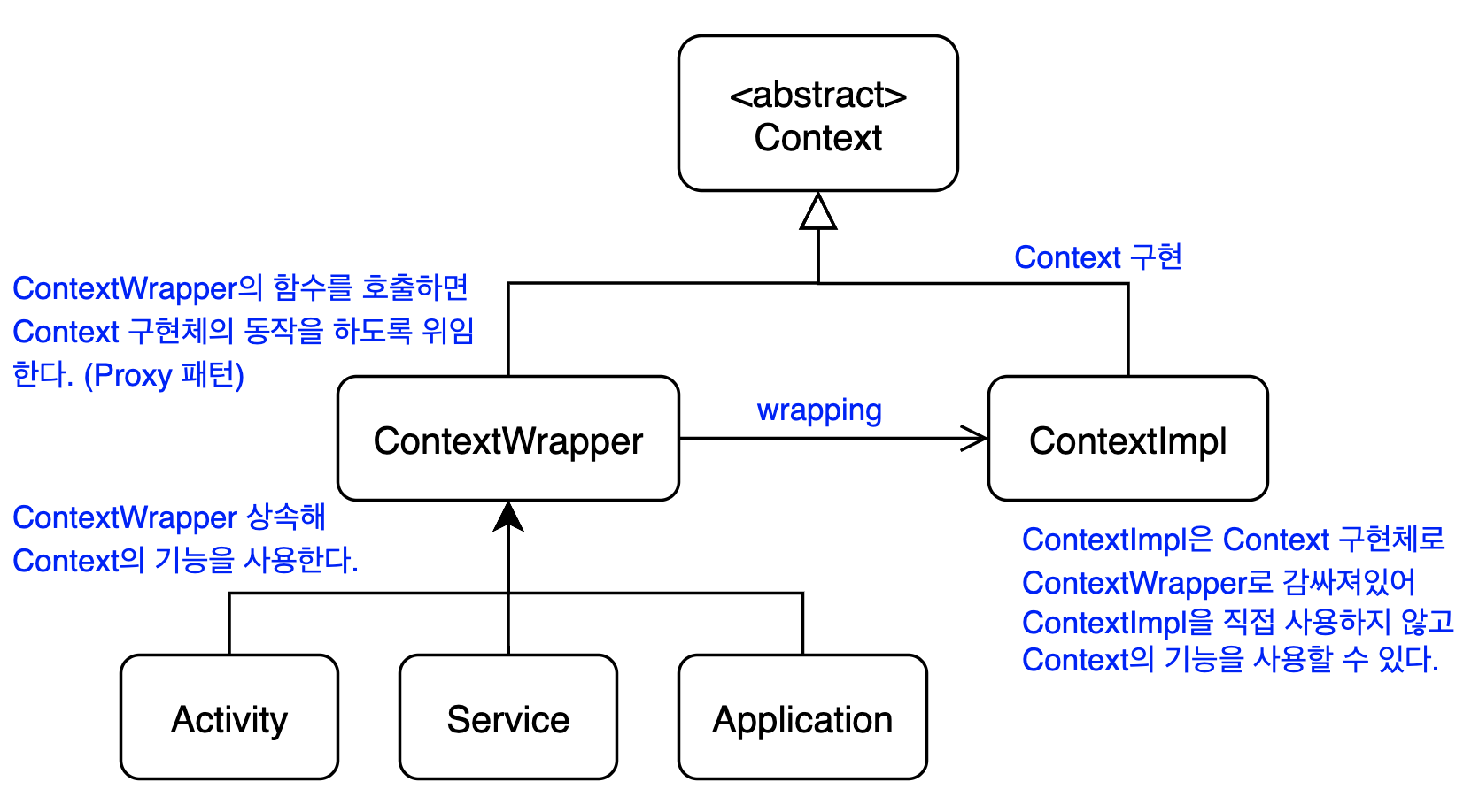 - 앞으로 "Context 구현체"라는 용어가 등장하는데, 이는 ContextWrapper가 wrapping하는 Context 구현체가 ContextImpl이 아닐 수 있기 때문에 ContextImpl과 용어를 구분하기 위함이다.