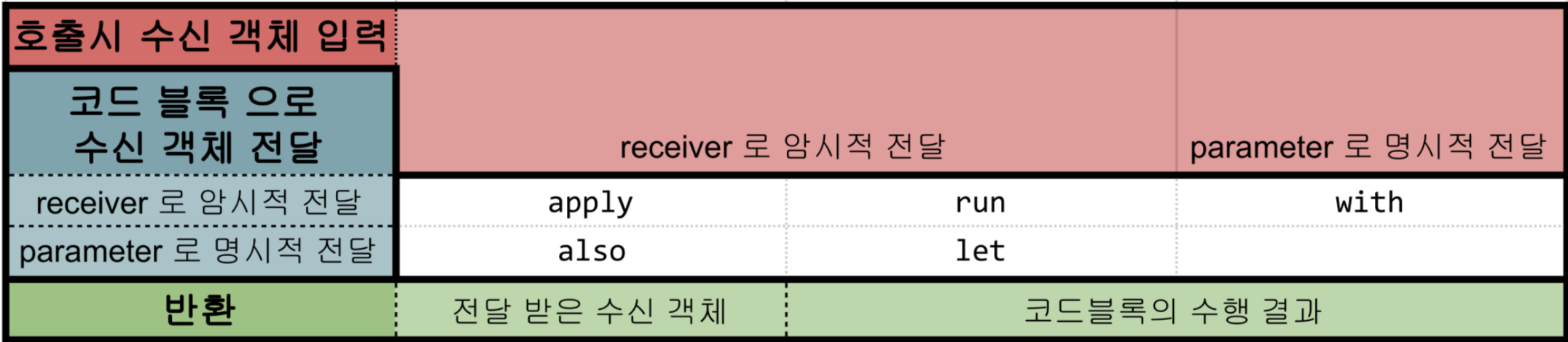 그 중에서 apply, with, also, let, run가 있는데 이는 서로 비슷하면서 다르기 때문에 적절한 상황에 잘 사용해야 한다. 어떤 상황에서 어느 함수를 사용하면 좋은지 구분하기 위해 정리를 해 보았다.