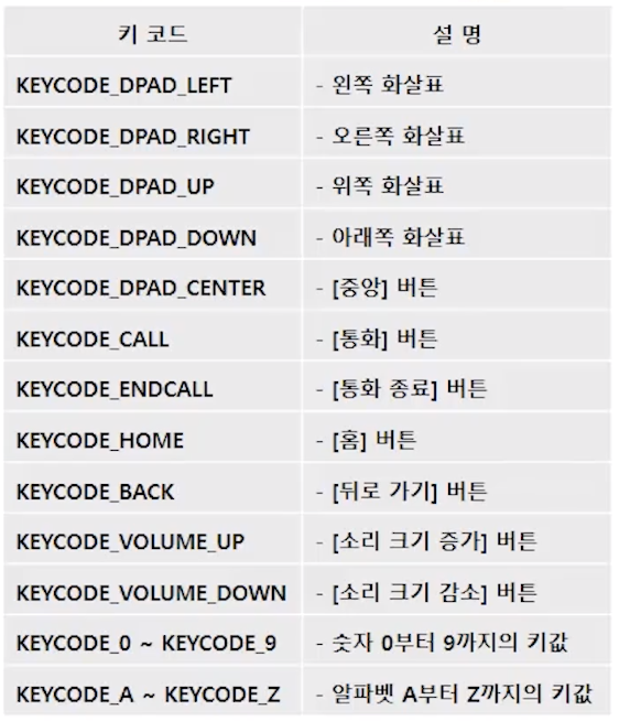 | 키 이벤트 | 키패드나 하드웨어 버튼을 누를 때 발생하는 이벤트 |