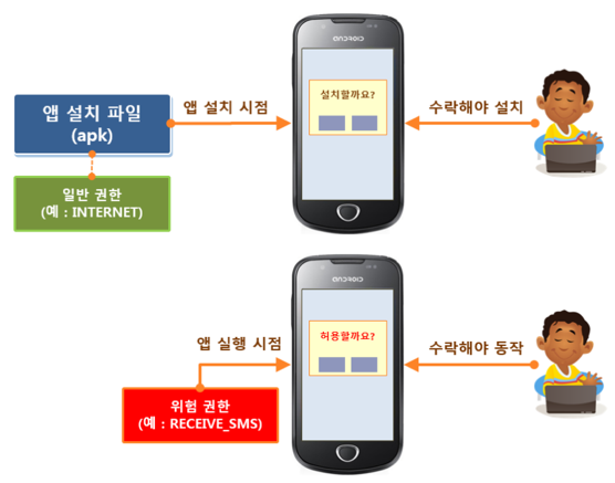 위험 권한으로 분류된 주요 권한들을 보면 대부분 개인정보가 담겨있는 정보에 접근하거나 개인정보를 만들어낼 수 있는 단말의 주요 장치에 접근할 때 부여된다. 대표적인 위험 권한은 위치, 카메라, 마이크, 연락처, 전화, 문자, 일정, 센서 정보가 될 수 있다. 또한 SD 카드에 접근할 때 사용하는 READ_EXTERNAL_STORAGE와 WRITE_EXTERNAL_STORAGE도 위험 권한으로 분류된다.