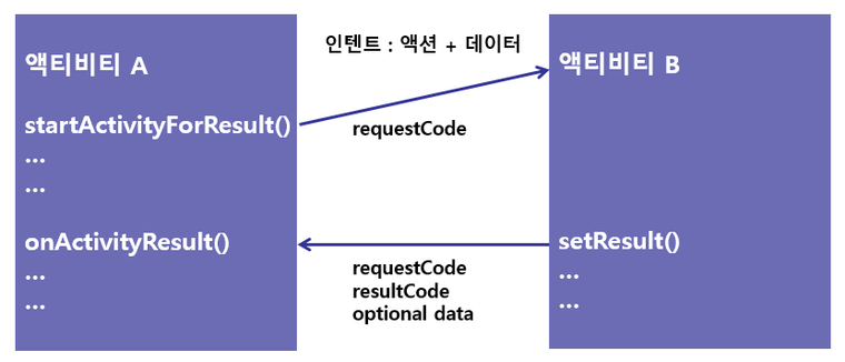위의 그림처럼 액티비티B 에서는 setResult()를 호출해서 응답을 보내고, 액티비티A 에서는 onActivityResult()를 통해 응답을 받는다.