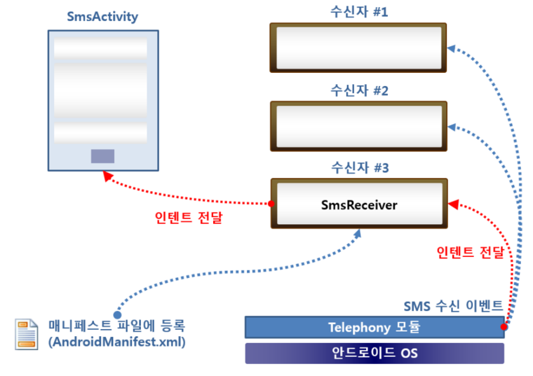 브로드캐스트 수신자(Broadcast Receiver) - 핸드폰에서 수신한 SMS 문자를 브로드캐스팅 하면 브로드캐스트 수신자가 이를 받아서 처리한다.