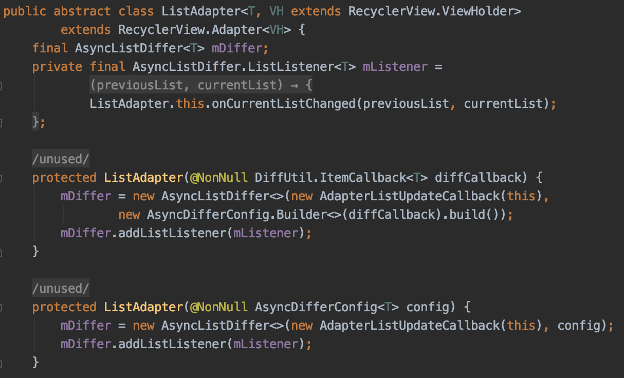 ListAdapter는 추상클래스로 아래 구현부 코드를 보면 우리가 AsyncListDiffer를 사용했을 때 코드처럼 RecyclerView의 Adapter를 상속하고, AsyncListDiffer를 만들어서 사용하고 있다. 그렇기 때문에 AsyncListDiffer의 submitList()와 currentList도 그대로 사용할 수 있다.