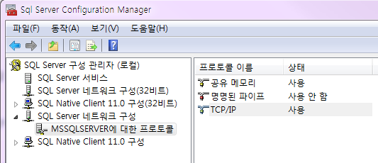 이를 해결하기 위해 SQL Server 구성관리자에 들어가서 아래 화면과 같이 네트워크 구성 > 프로토콜 > TCP/IP를 "사용" 으로 변경한 뒤 SQL Server 구성관리자에서 인스턴스를 재시작했다.