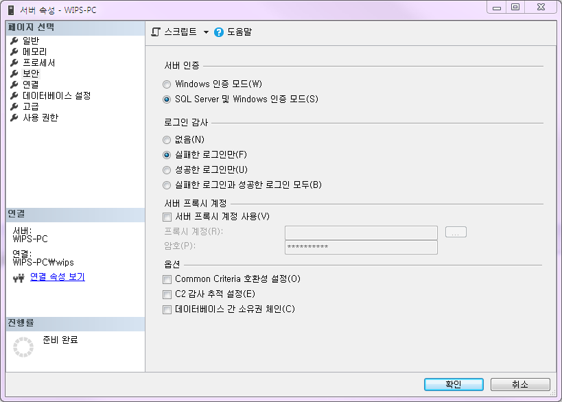 [개체 탐색기]에서 서버 이름을 우클릭한 뒤 [속성] > [보안] > [서버 인증]에 들어가서 [SQL Server 및 Windows 인증모드(S)]로 인증 방법을 변경한다.