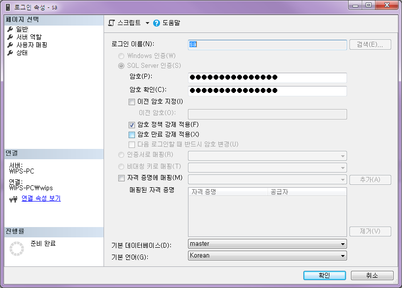 이제 [개체 탐색기]에 있는 서버의 하위 목록인 [보안] > [로그인] 으로 들어가면 sa가 있는데 이를 더블클릭하면 아래 화면이 나온다. 여기서 암호를 변경한 뒤 SQL Server 구성관리자에서 인스턴스를 재시작하면 된다.