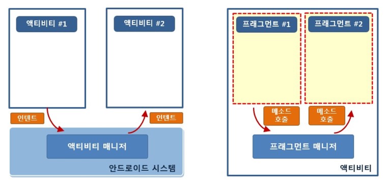 액티비티는 안드로이드 시스템의 액티비티 매니저가 관리하고, 인텐트를 이용해 명령이나 데이터를 주고 받는다. 하지만 프래그먼트는 액티비티의 프래그먼트 매니저가 관리하고, 단순히 메서드를 만들어 데이터를 주고 받는다. 또한 액티비티에 따라 프래그먼트의 코드가 달라지지 않도록 인터페이스를 정의해서 구현하는 방식으로 만드는 것을 권장한다. 이 방법의 또 다른 장점은, 액티비티마다 다른 이름의 메서드를 만들면 프래그먼트가 올라간 액티비티가 다른 액티비티로 변경되었을 때 해당 액티비티가 무엇인지 매번 확인한 뒤 해당 액티비티의 메서드를 호출해야 하는데 이런 번거로움이 해결된다는 것이다.