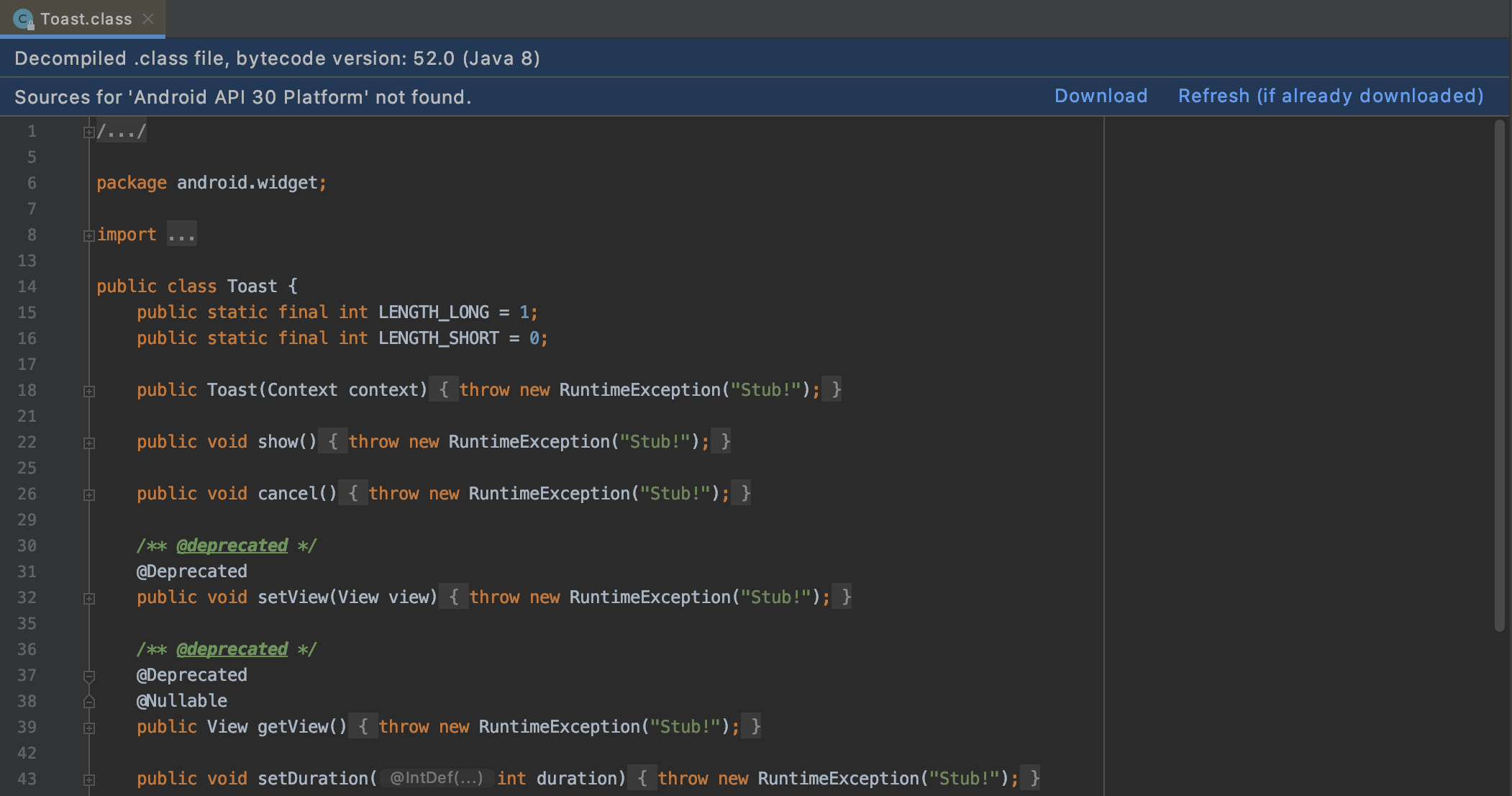 안드로이드 스튜디오에서 내부 소스 코드를 보려고 할 때 위 처럼 모든 구현부가 RuntimeException을 던지는 파일이 나올 때가 있다.