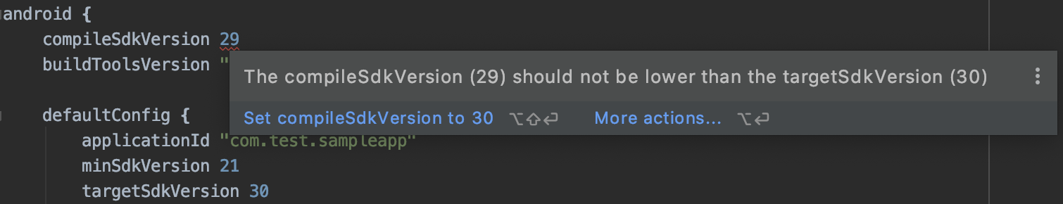이는 targetSdkVersion보다 compileSdkVersion이 낮을 수 없기 때문인데, 이는 Gradle 호환성과 관련이 있다. 해결 방법은 2가지가 있다.