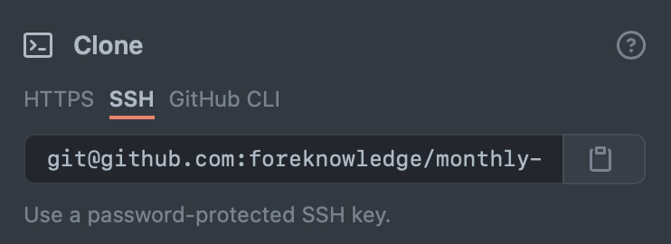GitHub에 공개 키가 등록 되어있는지 확인하는 가장 간단한 방법은 아무 리포지토리에 들어가서 clone을 클릭해서 SSH 탭을 들어갔을 때 SSH Key가 없는 경우 아래 노란색 박스 경고창이 뜬다.