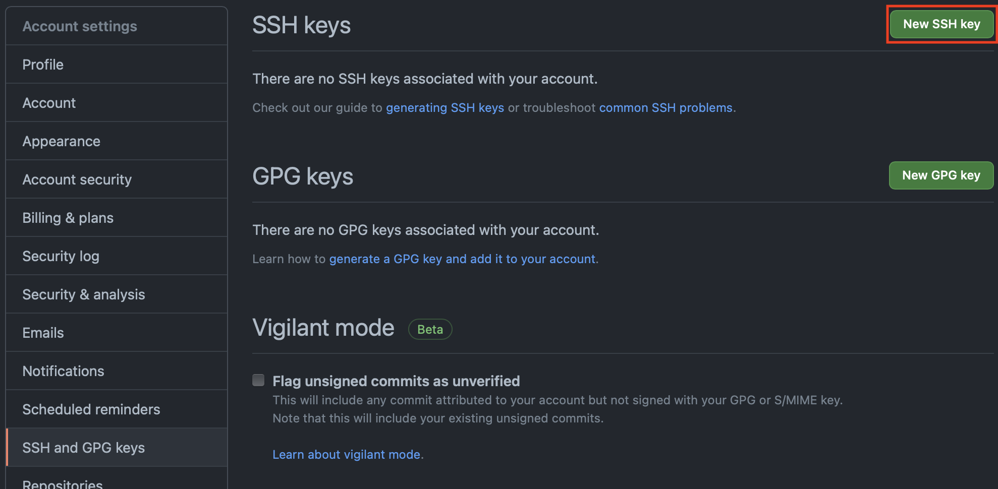 2. [SSH and GPG keys] 탭에 들어가서 [New SSH key]를 클릭한다.