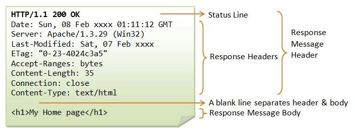 HTTP 응답 포맷(HTTP Response Format)은 요청 포맷과 크게 다르지 않다. 헤더와 바디로 구분되고 헤더에는 한 줄씩 속성이 들어가며, 응답의 첫 줄은 상태를 나타내고 HTTP 버전과 응답 코드, 응답 메시지 등으로 구성된다.