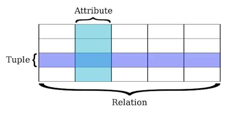 RDB 테이블은 다음과 같은 구조를 가지고 있다. 세로 줄을 속성(Attribute)라고 부르고, 가로 줄을 튜플(Tuple)이라고 부른다. 속성과 튜플로 이루어진 전체를 Relation이라고 부른다.